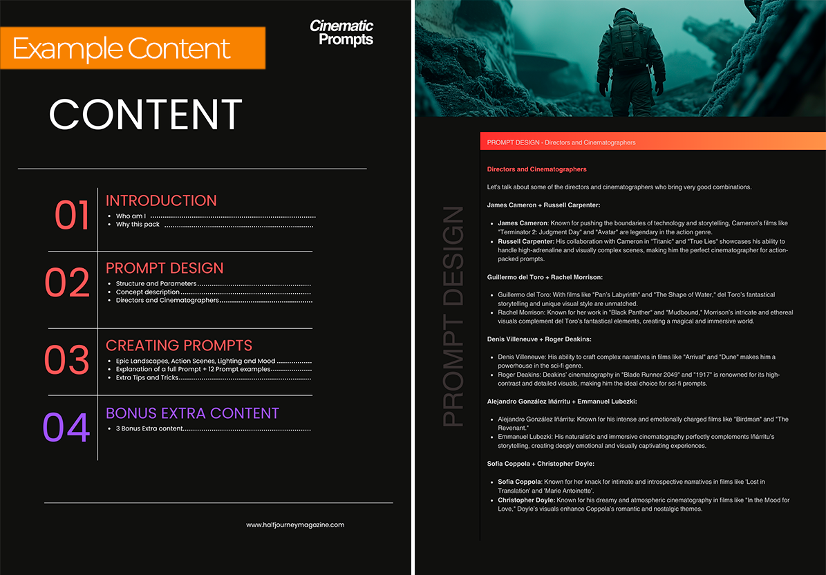 This PDF 30 pages tutorial includes a detailed explanation of how to create cinematic prompts with versions 6 and 7 of Midjourney. It includes 12 prompt examples and also includes 3 extra bonuses with one of Promtpbase's best-selling cinematic prompts, a database of directors and cinematographers to experiment with (Node and Excel formats), and a Custom GPT created to be your assistant in creating cinematic prompts. All for $29.45.