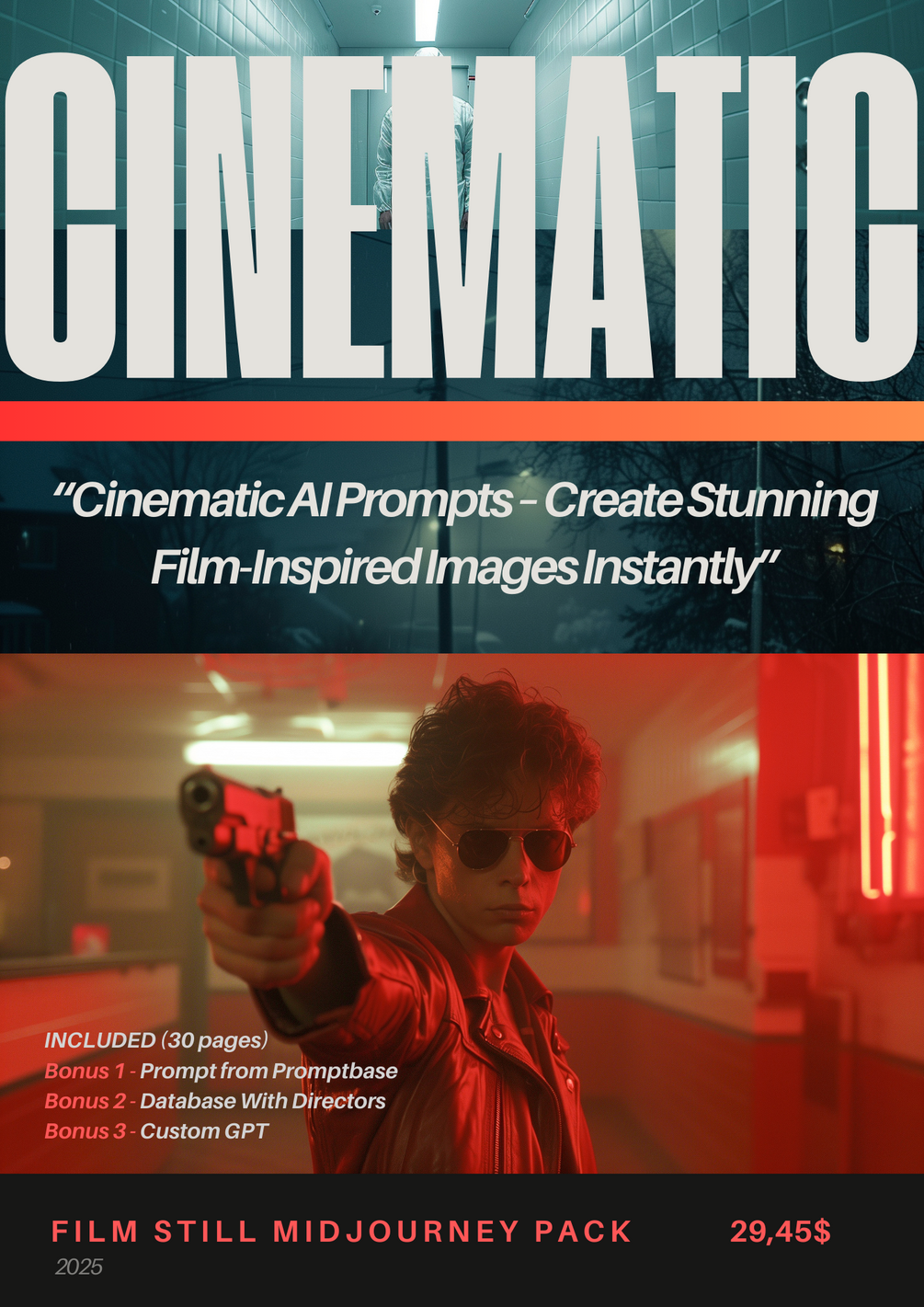 This PDF 30 pages tutorial includes a detailed explanation of how to create cinematic prompts with versions 6 and 7 of Midjourney. It includes 12 prompt examples and also includes 3 extra bonuses with one of Promtpbase's best-selling cinematic prompts, a database of directors and cinematographers to experiment with (Node and Excel formats), and a Custom GPT created to be your assistant in creating cinematic prompts. All for $29.45.